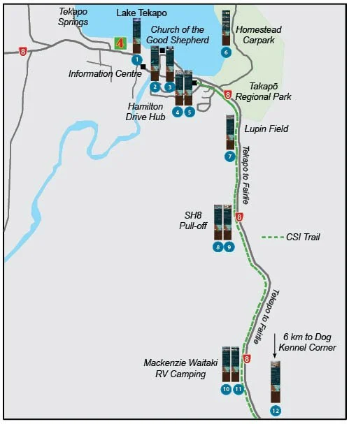 Alongside The Tekapo Trails Society, five other contributing organisations have been involved in this project: Takapō Regional Park, Tekapo Lions, Aoraki Mackenzie International Dark Sky Reserve, The Church of the Good Shepherd, and Genesis Energy. Each organisation worked with Tekapo Trails to adopt the same panel design. These panels depict some history, information on ecology, the Church of the Good Shepherd, the Hydro Power Scheme, and the Dark Sky Reserve.